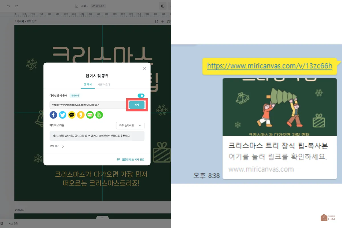 복사하고, 원하는 카카오톡 등 원하는 SNS에 템플릿 링크를 붙여 넣기 합니다.