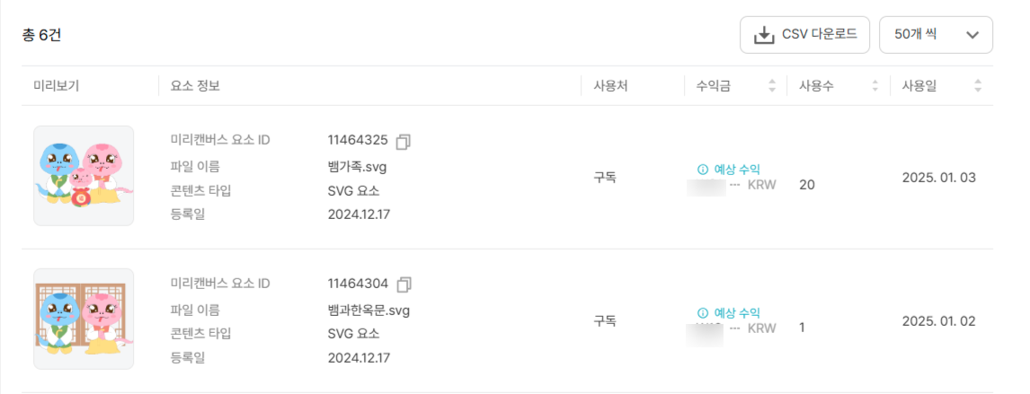 제 콘텐츠의 사용내역은 이런식으로 수익이 나와요.