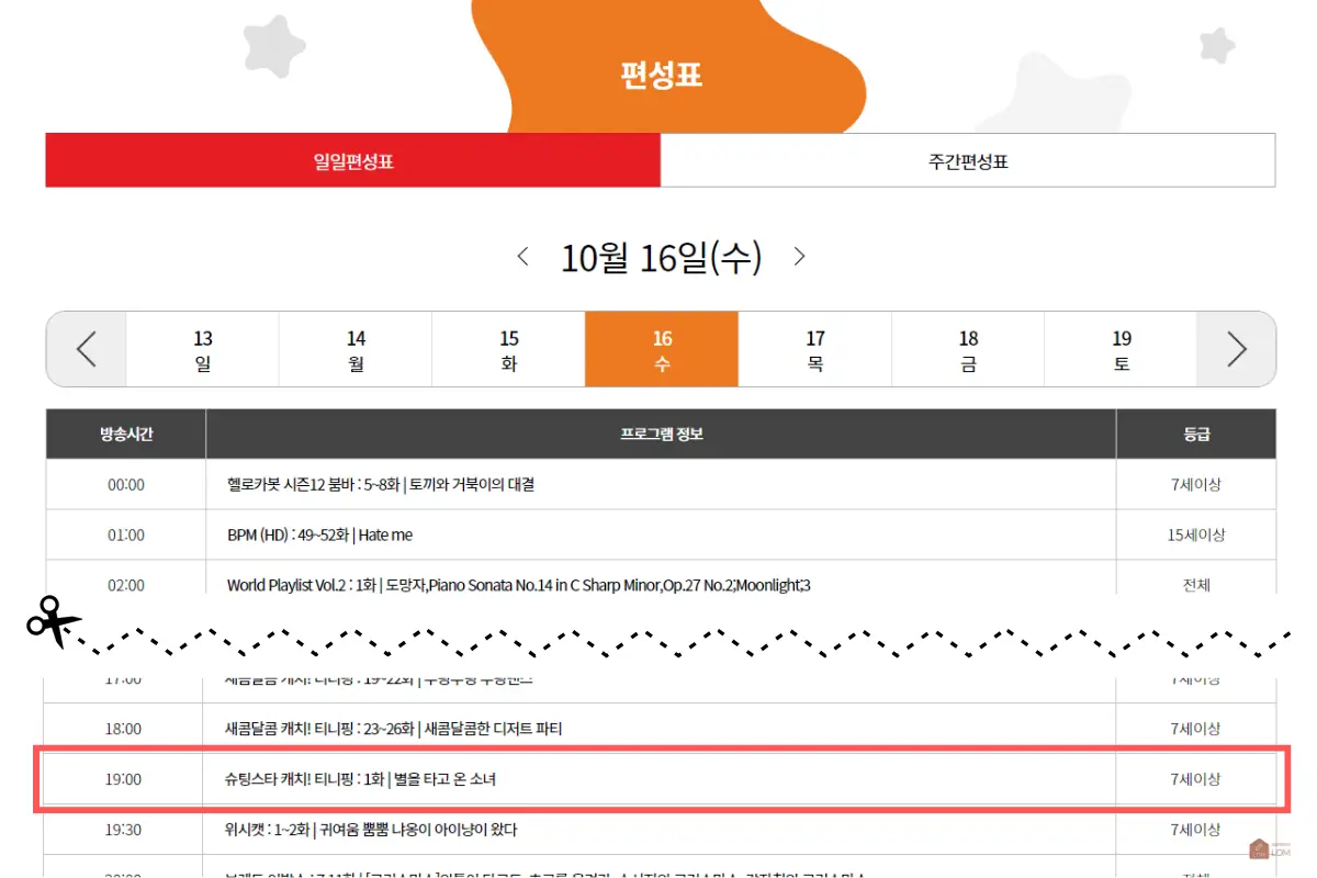 - 매주 수요일 저녁 7시: 슈팅스타 캐치티니핑 최신 에피소드