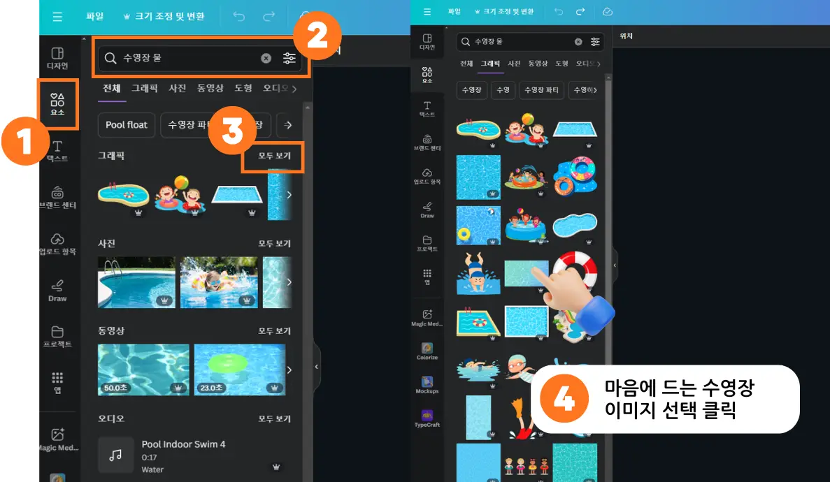 - 1. 요소탭을 클릭 후 > 2. 수영장 물이라고 검색합니다.