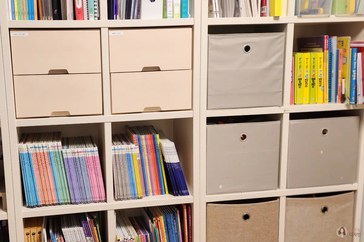 샘책장의 장점이 이렇게 서랍장을 넣거나 수납박스를 이용해서 자유롭게 활용할 수 있다는 점 같아요.