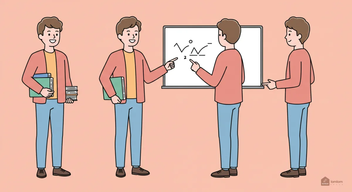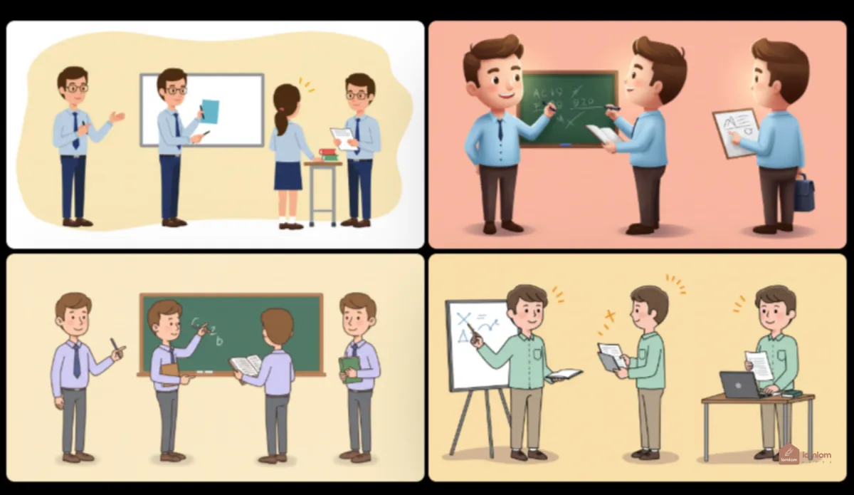 male teacher , 2D Illustrations , side view , full body , three pose , eye level , Bright pastels , Bright lighting