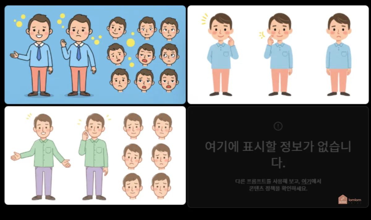 멀티포즈로 이미지를 생성하니 자세하게 보기는 조금 힘들어서 4가지나 3가지 포즈가 적당한 것 같아요.
